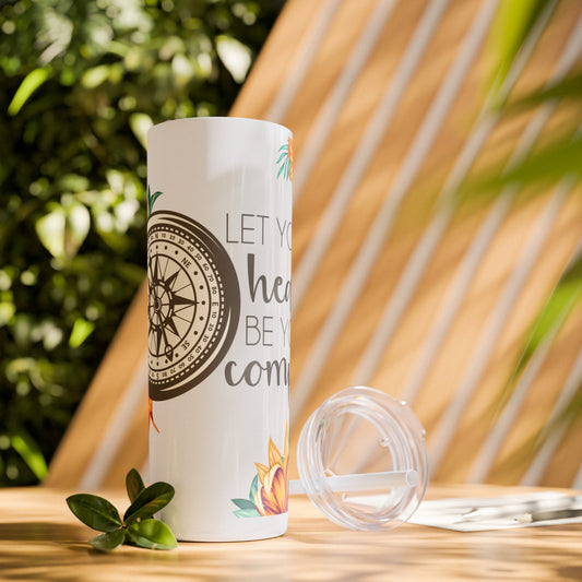 Follow Your Heart: Floral Compass Travel Tumbler with Inspirational Quote - Skinny Tumbler with Straw, 20oz