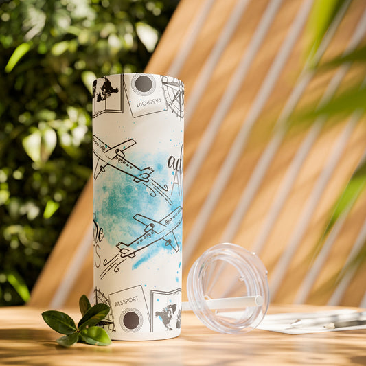 Adventure Awaits Watercolor Travel Tumbler with Airplanes - Skinny Tumbler with Straw, 20oz